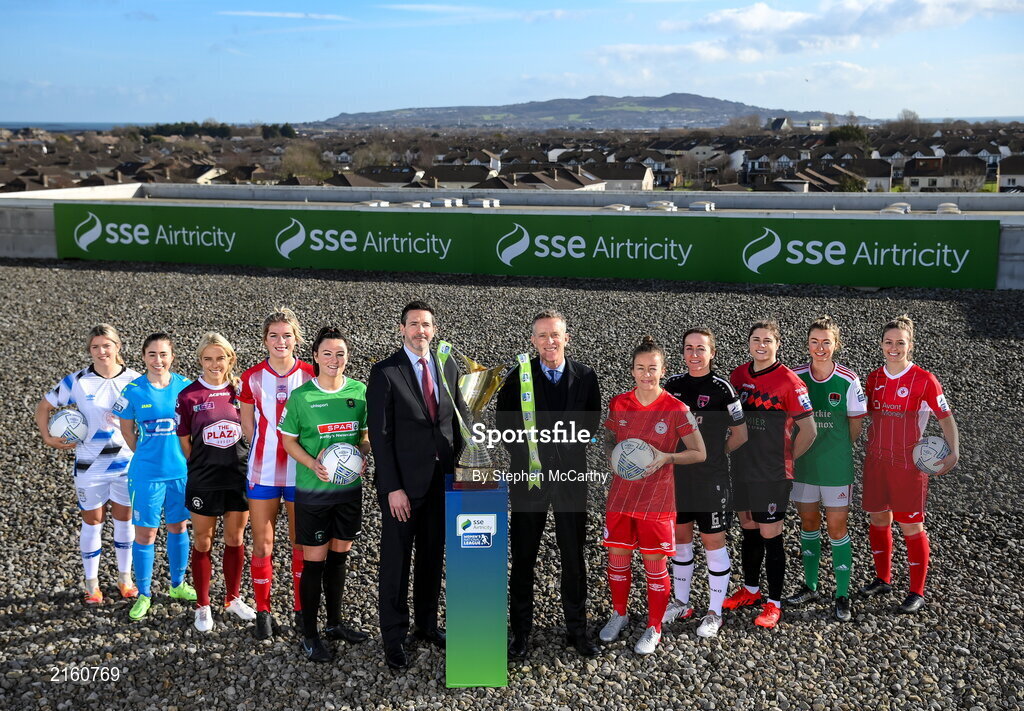 9 February 2022; David Manning, Director of Customer Marketing, SSE Airtricity, left, and FAI chief executive Jonathan Hill, with SSE Airtricity Women's National League players, from left, Laurie Ryan of Athlone Town AFC, Rachel Doyle of DLR Waves, Julie Ann Russell of Galway Women, Jesse Mendez of Treaty United, Tiegan Ruddy of Peamount United, Pearl Slattery of Shelbourne, Kylie Murphy of Wexford Youths Women, Sinead Taylor of Bohemians, Danielle Burke of Cork City, Emma Hansberry of Sligo Rovers at the launch of the SSE Airtricity Premier & First Division and Women's National League 2022 season held at at HBV Studios in Clarehall, Dublin. Photo by Stephen McCarthy/Sportsfile