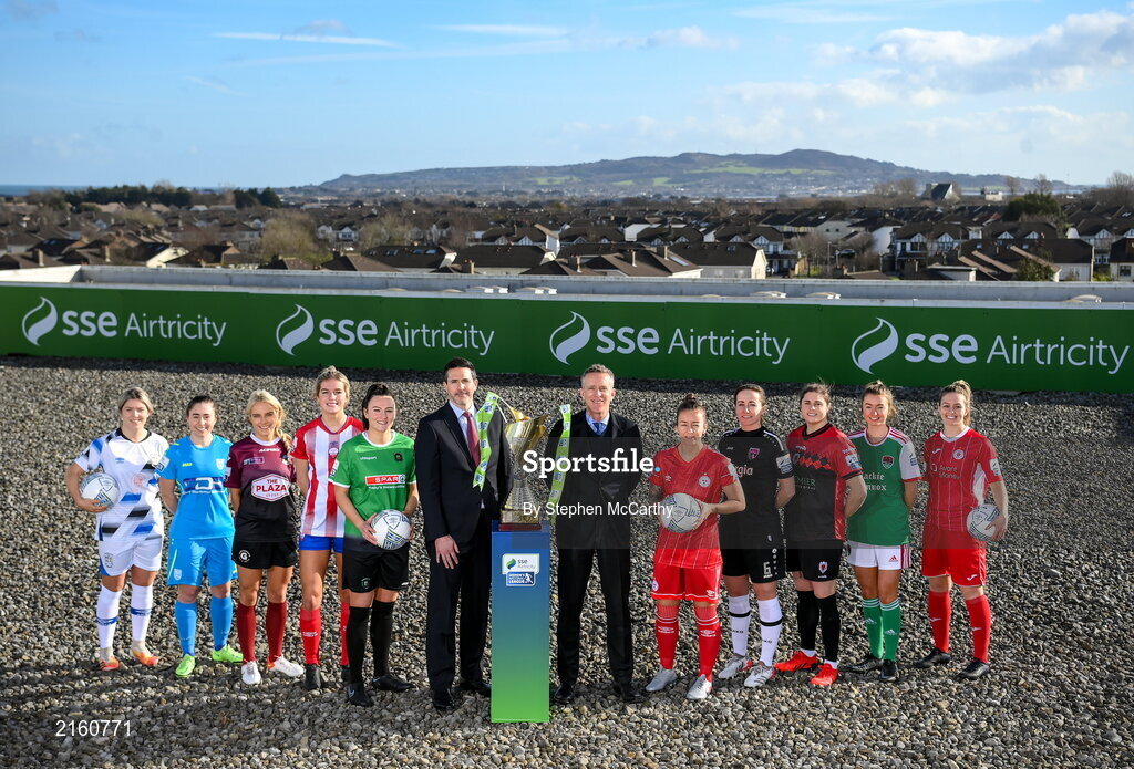 9 February 2022; David Manning, Director of Customer Marketing, SSE Airtricity, left, and FAI chief executive Jonathan Hill, with SSE Airtricity Women's National League players, from left, Laurie Ryan of Athlone Town AFC, Rachel Doyle of DLR Waves, Julie Ann Russell of Galway Women, Jesse Mendez of Treaty United, Tiegan Ruddy of Peamount United, Pearl Slattery of Shelbourne, Kylie Murphy of Wexford Youths Women, Sinead Taylor of Bohemians, Danielle Burke of Cork City, Emma Hansberry of Sligo Rovers at the launch of the SSE Airtricity Premier & First Division and Women's National League 2022 season held at at HBV Studios in Clarehall, Dublin. Photo by Stephen McCarthy/Sportsfile
