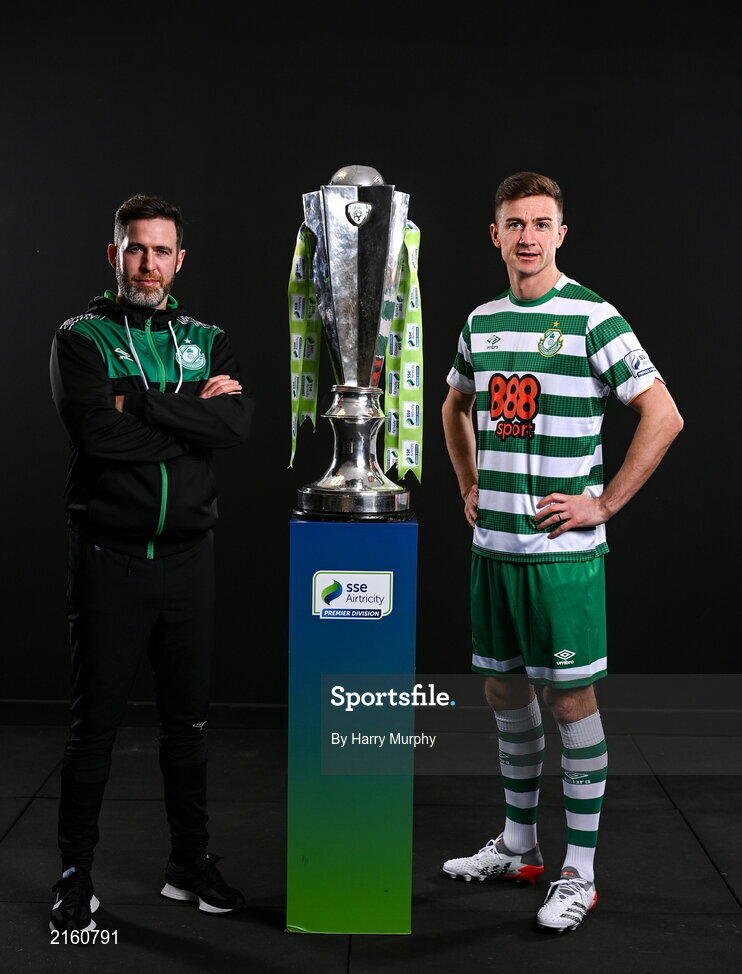9 February 2022; Shamrock Rovers manager Stephen Bradley and Ronan Finn of Shamrock Rovers with the SSE Airtricity League Premier Division trophy at the launch of the SSE Airtricity Premier & First Division and Women's National League 2022 season held at at HBV Studios in Clarehall, Dublin. Photo by Harry Murphy/Sportsfile