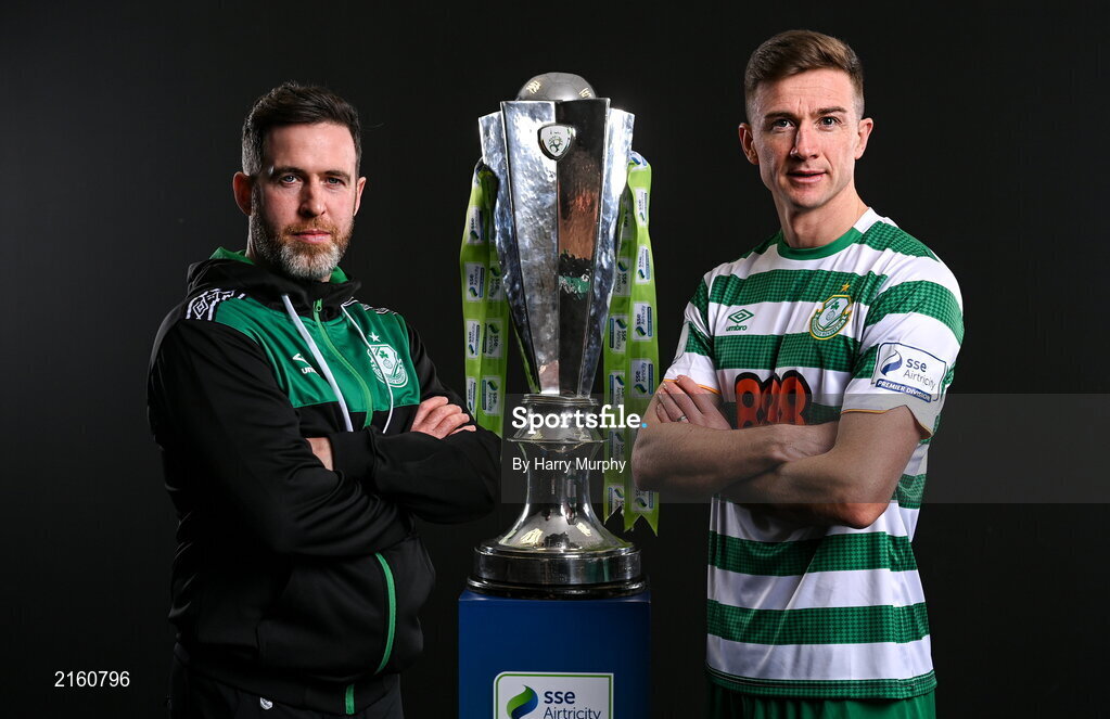 9 February 2022; Shamrock Rovers manager Stephen Bradley and Ronan Finn of Shamrock Rovers with the SSE Airtricity League Premier Division trophy at the launch of the SSE Airtricity Premier & First Division and Women's National League 2022 season held at at HBV Studios in Clarehall, Dublin. Photo by Harry Murphy/Sportsfile
