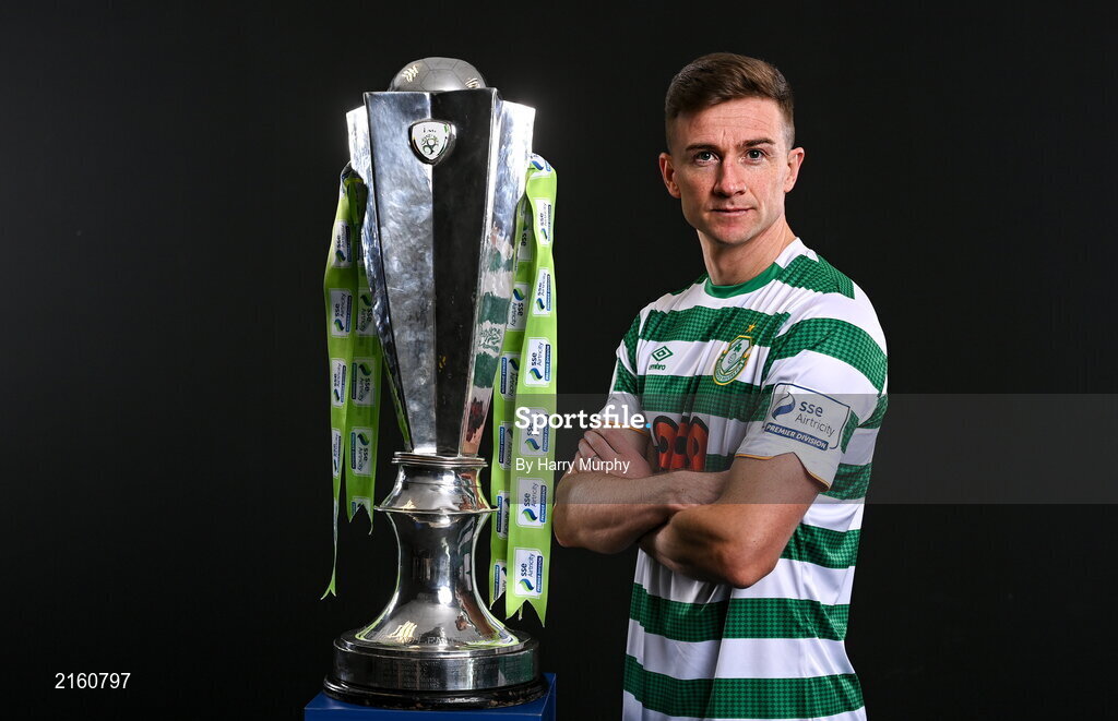 9 February 2022; Ronan Finn of Shamrock Rovers with the SSE Airtricity League Premier Division trophy at the launch of the SSE Airtricity Premier & First Division and Women's National League 2022 season held at at HBV Studios in Clarehall, Dublin. Photo by Harry Murphy/Sportsfile