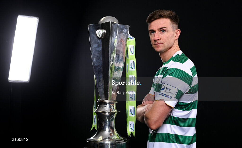 9 February 2022; Ronan Finn of Shamrock Rovers with the SSE Airtricity League Premier Division trophy at the launch of the SSE Airtricity Premier & First Division and Women's National League 2022 season held at at HBV Studios in Clarehall, Dublin. Photo by Harry Murphy/Sportsfile