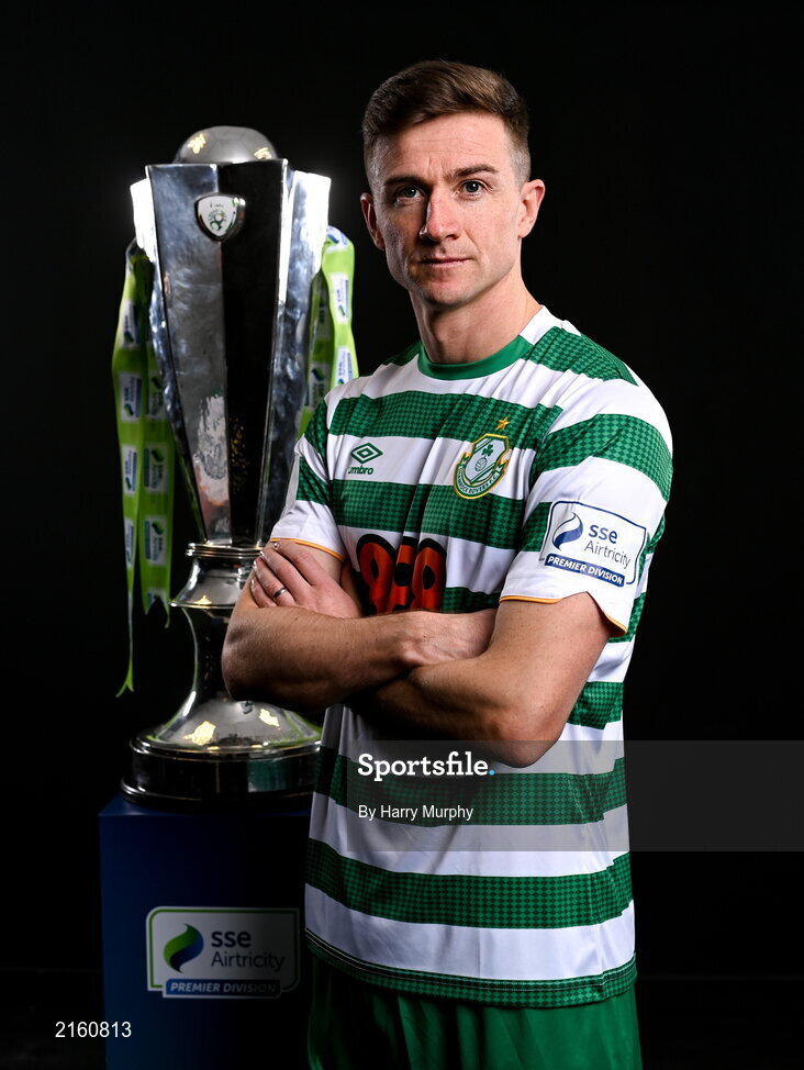 9 February 2022; Ronan Finn of Shamrock Rovers with the SSE Airtricity League Premier Division trophy at the launch of the SSE Airtricity Premier & First Division and Women's National League 2022 season held at at HBV Studios in Clarehall, Dublin. Photo by Harry Murphy/Sportsfile