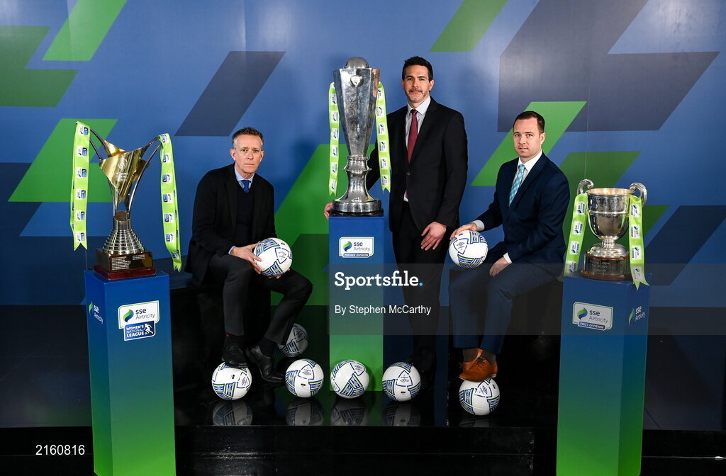 9 February 2022; David Manning, Director of Customer Marketing, SSE Airtricity, with FAI chief executive Jonathan Hill, left, and Mark Scanlon, League of Ireland director, right, at the launch of the SSE Airtricity Premier & First Division and Women's National League 2022 season held at at HBV Studios in Clarehall, Dublin. Photo by Stephen McCarthy/Sportsfile