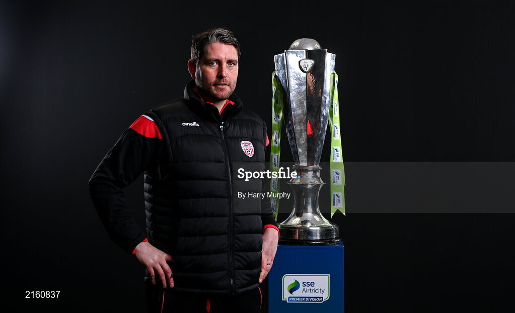 9 February 2022; Derry City manager Ruaidhri Higgins with the SSE Airtricity League Premier Division trophy at the launch of the SSE Airtricity Premier & First Division and Women's National League 2022 season held at at HBV Studios in Clarehall, Dublin. Photo by Harry Murphy/Sportsfile