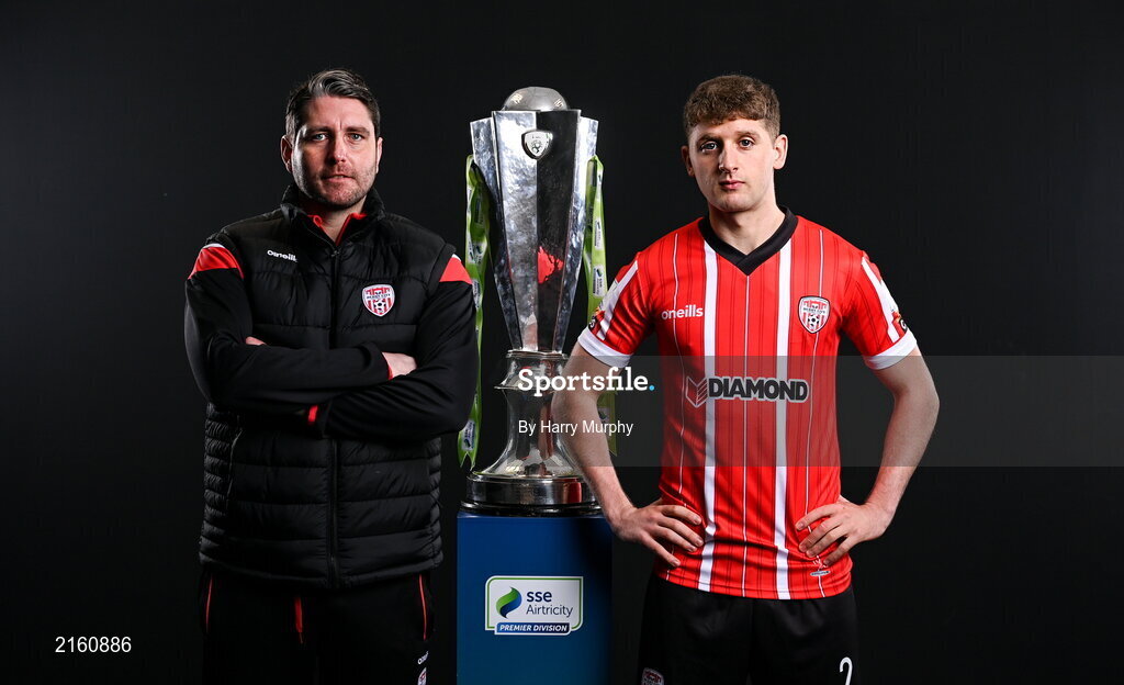 9 February 2022; Derry City manager Ruaidhri Higgins and Ronan Boyce with the SSE Airtricity League Premier Division trophy at the launch of the SSE Airtricity Premier & First Division and Women's National League 2022 season held at at HBV Studios in Clarehall, Dublin. Photo by Harry Murphy/Sportsfile