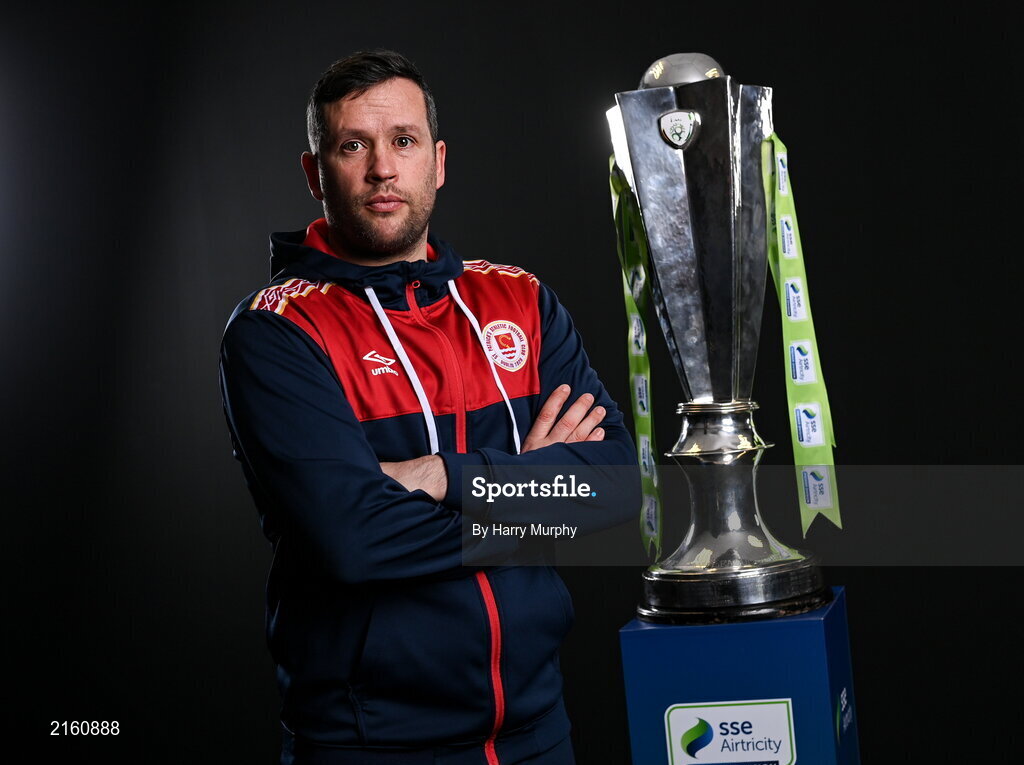9 February 2022; St Patrick's Athletic manager Tim Clancy with the SSE Airtricity League Premier Division trophy at the launch of the SSE Airtricity Premier & First Division and Women's National League 2022 season held at HBV Studios in Clarehall, Dublin. Photo by Harry Murphy/Sportsfile