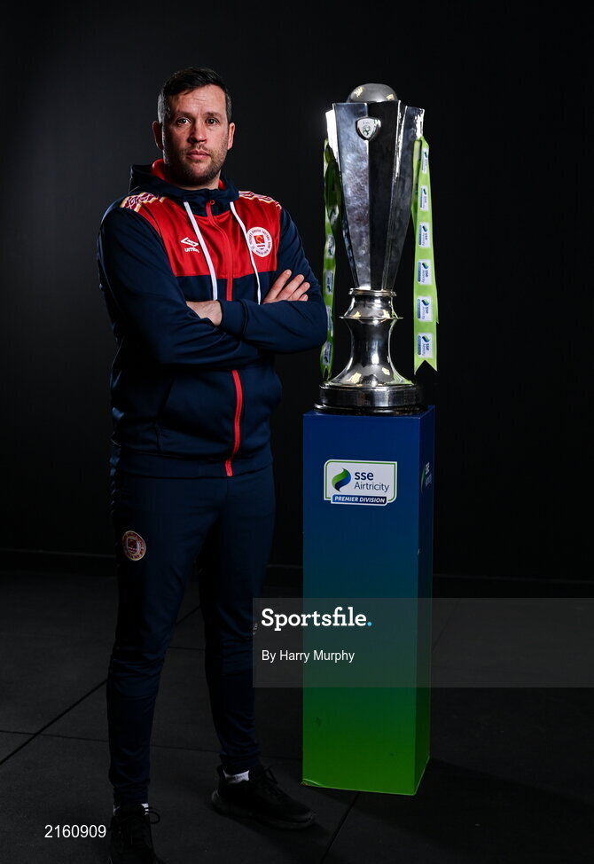 9 February 2022; St Patrick's Athletic manager Tim Clancy with the SSE Airtricity League Premier Division trophy at the launch of the SSE Airtricity Premier & First Division and Women's National League 2022 season held at HBV Studios in Clarehall, Dublin. Photo by Harry Murphy/Sportsfile