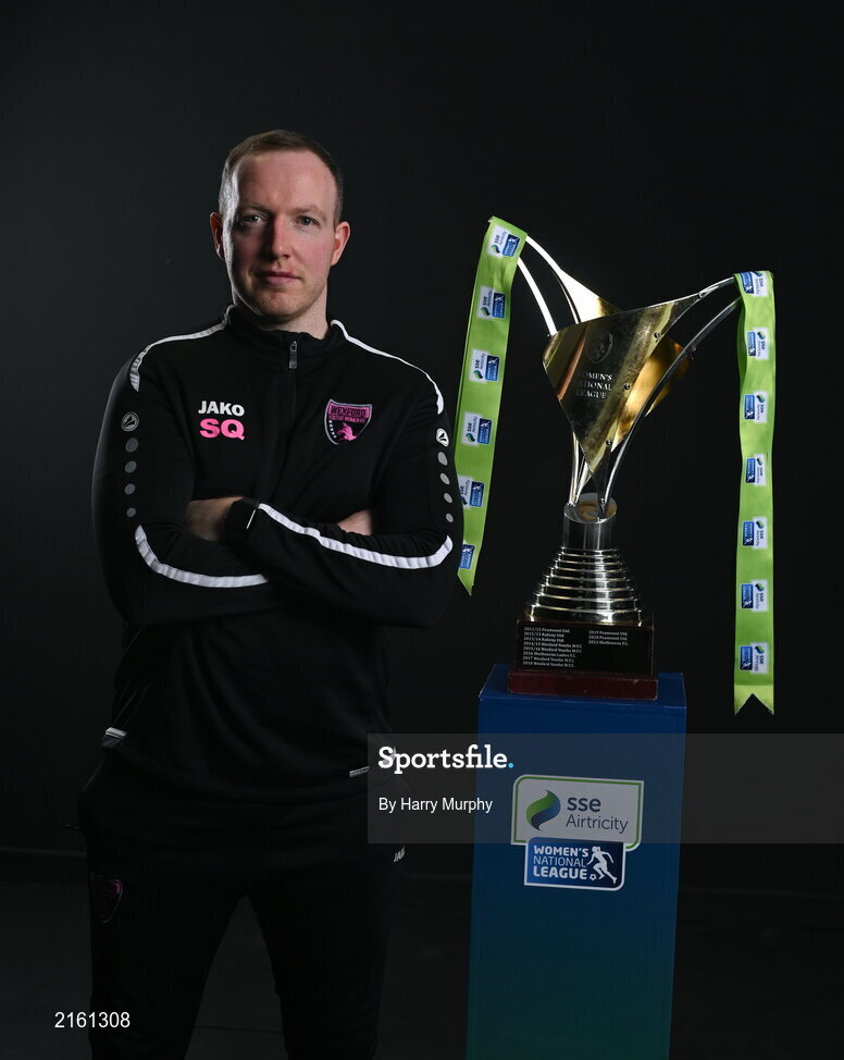 9 February 2022; Wexford Youths Women manager Stephen Quinn with the SSE Airtricity Women's National League trophy at the launch of the SSE Airtricity Premier & First Division and Women's National League 2022 season held at HBV Studios in Clarehall, Dublin. Photo by Harry Murphy/Sportsfile