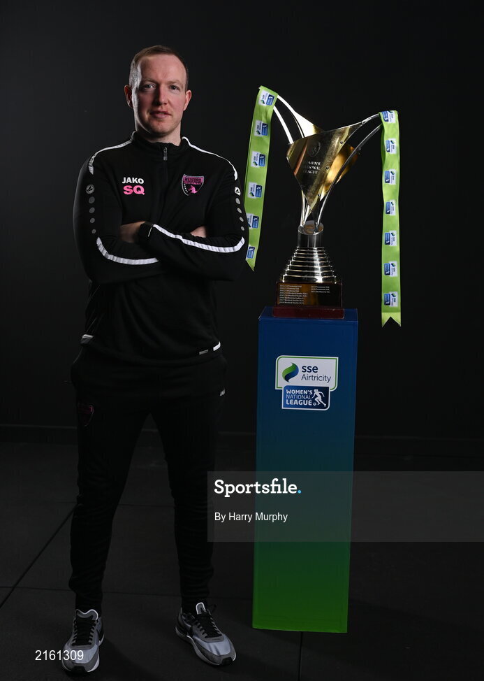 9 February 2022; Wexford Youths Women manager Stephen Quinn with the SSE Airtricity Women's National League trophy at the launch of the SSE Airtricity Premier & First Division and Women's National League 2022 season held at HBV Studios in Clarehall, Dublin. Photo by Harry Murphy/Sportsfile