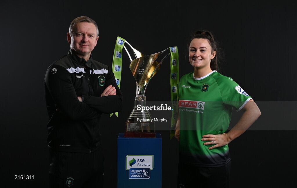 9 February 2022; Peamount United manager James O'Callaghan and Tiegan Ruddy of Peamount United with the SSE Airtricity Women's National League trophy at the launch of the SSE Airtricity Premier & First Division and Women's National League 2022 season held at HBV Studios in Clarehall, Dublin. Photo by Harry Murphy/Sportsfile