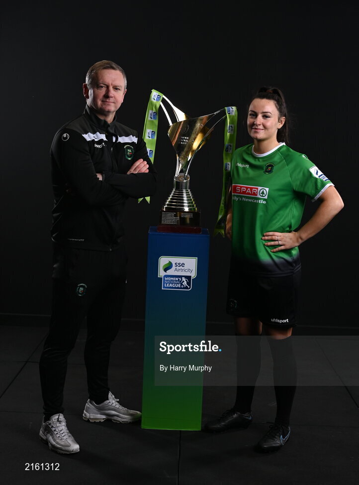 9 February 2022; Peamount United manager James O'Callaghan and Tiegan Ruddy of Peamount United with the SSE Airtricity Women's National League trophy at the launch of the SSE Airtricity Premier & First Division and Women's National League 2022 season held at HBV Studios in Clarehall, Dublin. Photo by Harry Murphy/Sportsfile