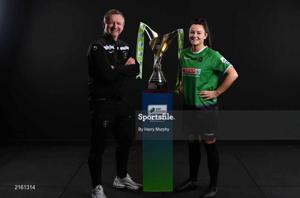 9 February 2022; Peamount United manager James O'Callaghan and Tiegan Ruddy of Peamount United with the SSE Airtricity Women's National League trophy at the launch of the SSE Airtricity Premier & First Division and Women's National League 2022 season held at HBV Studios in Clarehall, Dublin. Photo by Harry Murphy/Sportsfile
