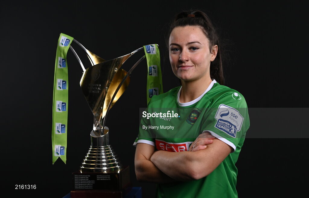 9 February 2022; Tiegan Ruddy of Peamount United with the SSE Airtricity Women's National League trophy at the launch of the SSE Airtricity Premier & First Division and Women's National League 2022 season held at HBV Studios in Clarehall, Dublin. Photo by Harry Murphy/Sportsfile