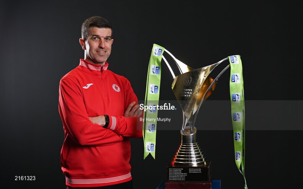 9 February 2022; Sligo Rovers manager Steve Feeney with the SSE Airtricity Women's National League trophy at the launch of the SSE Airtricity Premier & First Division and Women's National League 2022 season held at HBV Studios in Clarehall, Dublin. Photo by Harry Murphy/Sportsfile