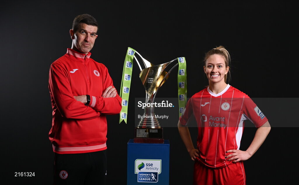 9 February 2022; Sligo Rovers manager Steve Feeney and Emma Hansberry of Sligo Rovers with the SSE Airtricity Women's National League trophy at the launch of the SSE Airtricity Premier & First Division and Women's National League 2022 season held at HBV Studios in Clarehall, Dublin. Photo by Harry Murphy/Sportsfile
