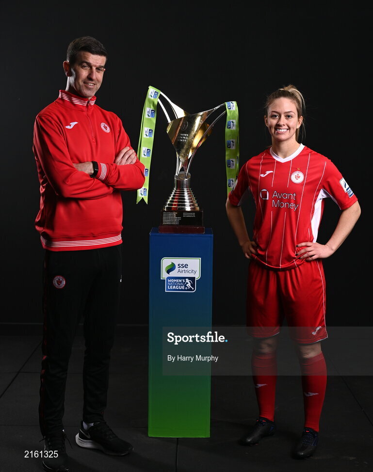 9 February 2022; Sligo Rovers manager Steve Feeney and Emma Hansberry of Sligo Rovers with the SSE Airtricity Women's National League trophy at the launch of the SSE Airtricity Premier & First Division and Women's National League 2022 season held at HBV Studios in Clarehall, Dublin. Photo by Harry Murphy/Sportsfile