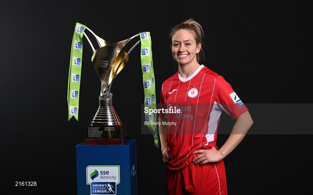 9 February 2022; Emma Hansberry of Sligo Rovers with the SSE Airtricity Women's National League trophy at the launch of the SSE Airtricity Premier & First Division and Women's National League 2022 season held at HBV Studios in Clarehall, Dublin. Photo by Harry Murphy/Sportsfile