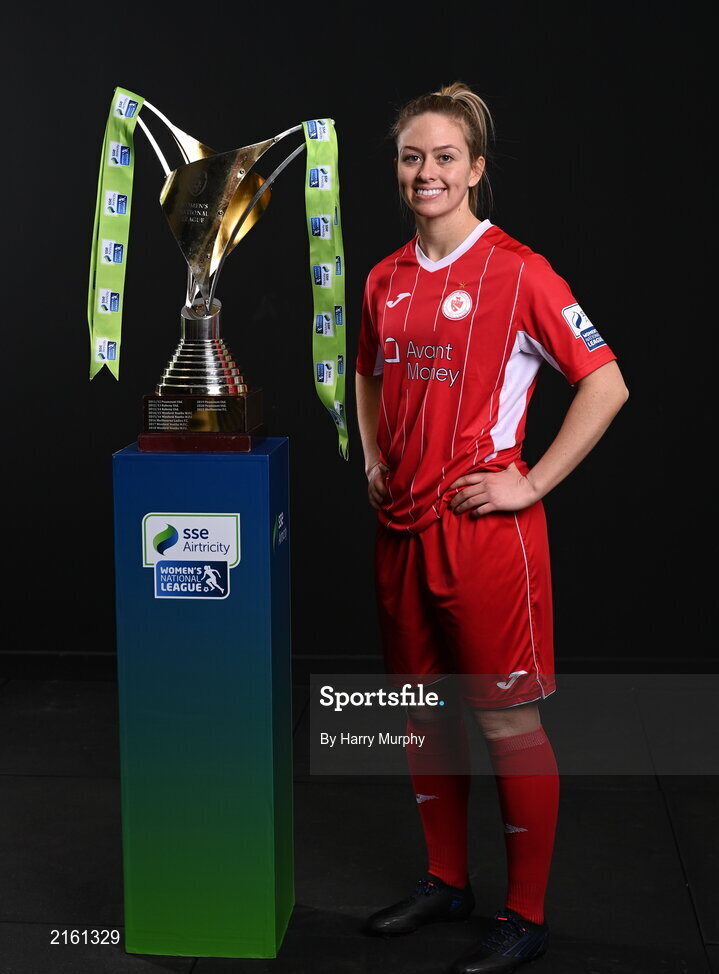 9 February 2022; Emma Hansberry of Sligo Rovers with the SSE Airtricity Women's National League trophy at the launch of the SSE Airtricity Premier & First Division and Women's National League 2022 season held at HBV Studios in Clarehall, Dublin. Photo by Harry Murphy/Sportsfile