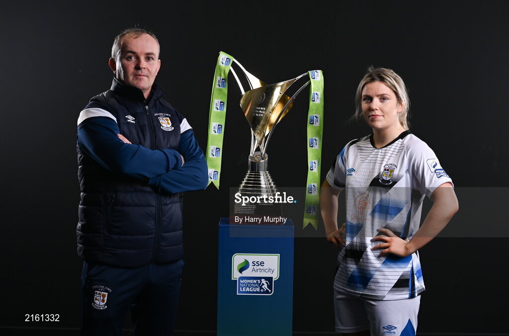 9 February 2022; Athlone Town manager Tommy Hewitt and Laurie Ryan of Athlone Town AFC with the SSE Airtricity Women's National League trophy at the launch of the SSE Airtricity Premier & First Division and Women's National League 2022 season held at HBV Studios in Clarehall, Dublin. Photo by Harry Murphy/Sportsfile