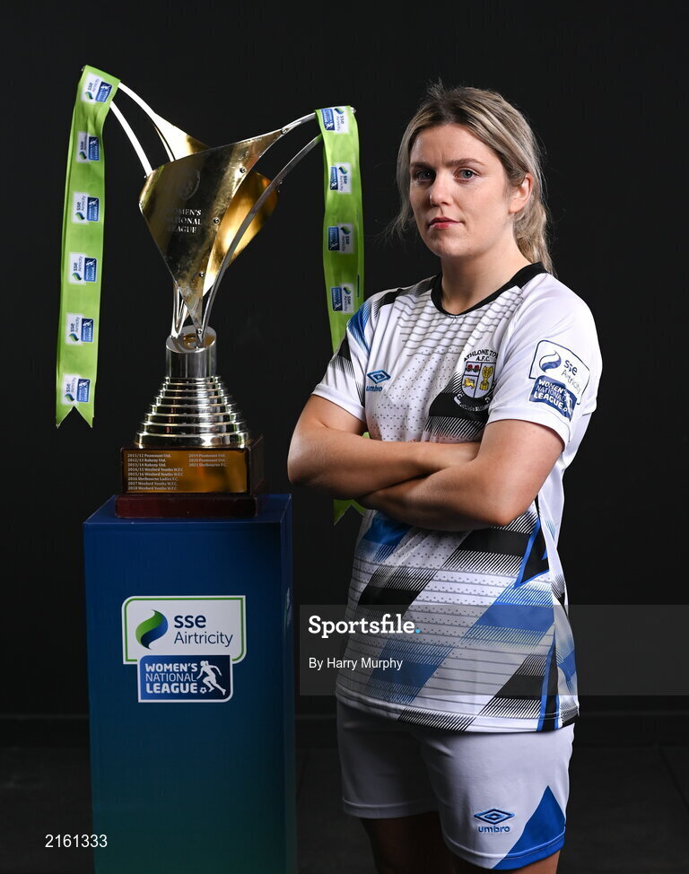 9 February 2022; Laurie Ryan of Athlone Town AFC with the SSE Airtricity Women's National League trophy at the launch of the SSE Airtricity Premier & First Division and Women's National League 2022 season held at HBV Studios in Clarehall, Dublin. Photo by Harry Murphy/Sportsfile