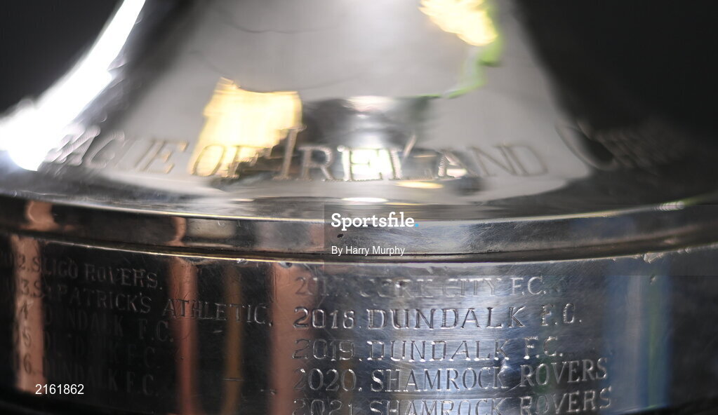 9 February 2022; A detailed view of the SSE Airtricity League Premier Division trophy at the launch of the SSE Airtricity Premier & First Division and Women's National League 2022 season held at at HBV Studios in Clarehall, Dublin. Photo by Harry Murphy/Sportsfile