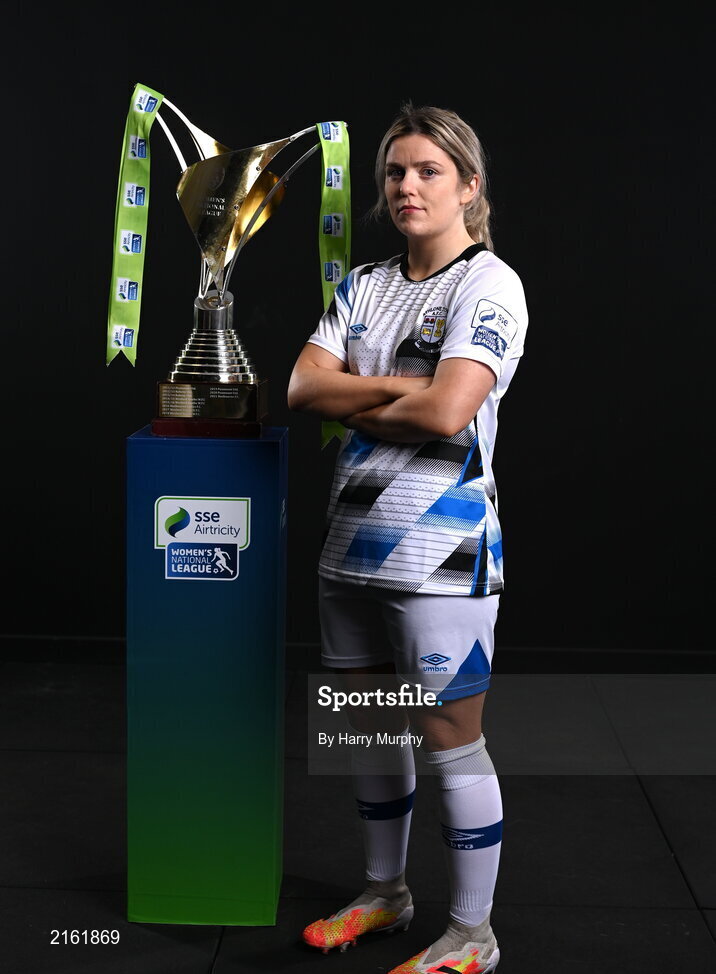 9 February 2022; Laurie Ryan of Athlone Town AFC with the SSE Airtricity Women's National League trophy at the launch of the SSE Airtricity Premier & First Division and Women's National League 2022 season held at HBV Studios in Clarehall, Dublin. Photo by Harry Murphy/Sportsfile
