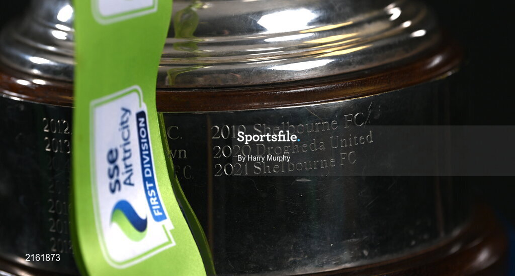 9 February 2022; A detailed view of the SSE Airtricity League First Division trophy at the launch of the SSE Airtricity Premier & First Division and Women's National League 2022 season held at at HBV Studios in Clarehall, Dublin. Photo by Harry Murphy/Sportsfile