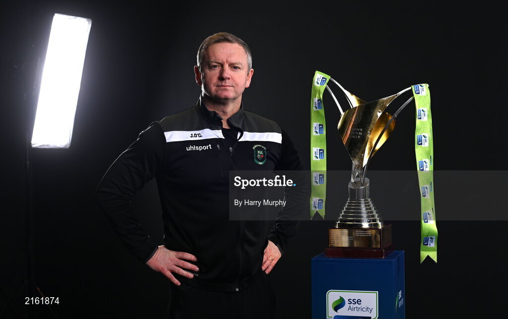 9 February 2022; Peamount United manager James O'Callaghan with the SSE Airtricity Women's National League trophy at the launch of the SSE Airtricity Premier & First Division and Women's National League 2022 season held at HBV Studios in Clarehall, Dublin. Photo by Harry Murphy/Sportsfile