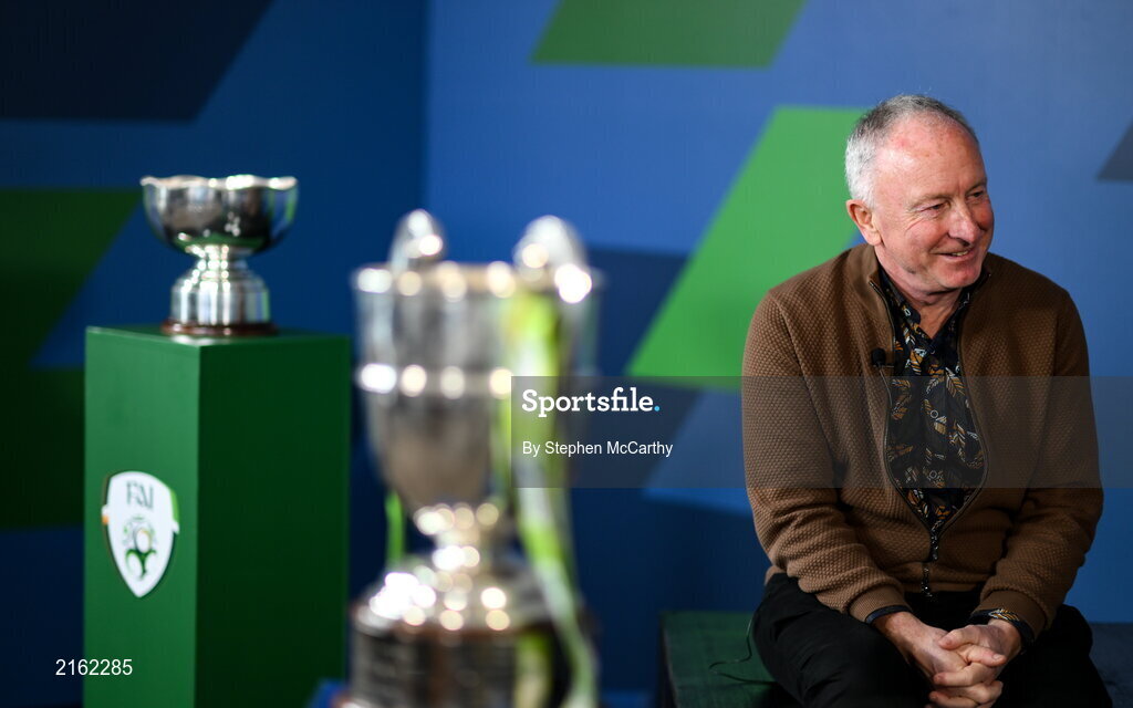 9 February 2022; Dermot Ahern, Chair of the FAI's National Leagues Committee, at the launch of the SSE Airtricity Premier & First Division and Women's National League 2022 season held at HBV Studios in Clarehall, Dublin. Photo by Stephen McCarthy/Sportsfile