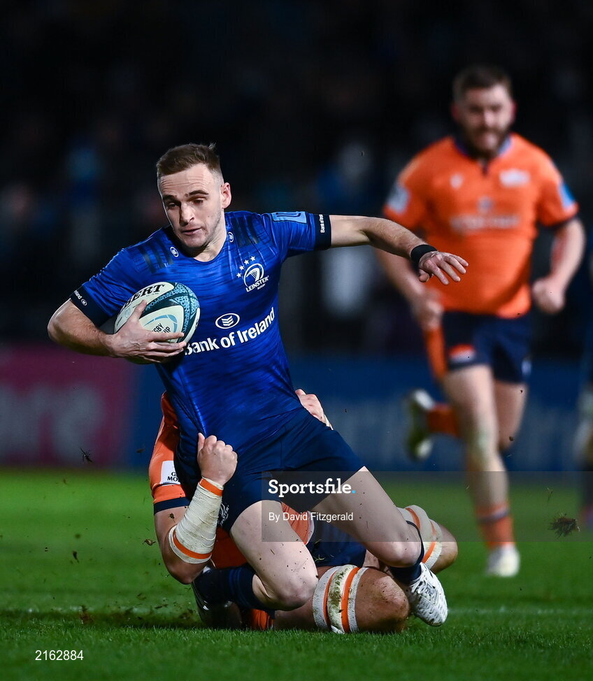 11 February 2022; Nick McCarthy of Leinster is tackled by Connor Boyle of Edinburgh during the United Rugby Championship match between Leinster and Edinburgh at the RDS Arena in Dublin. Photo by David Fitzgerald/Sportsfile