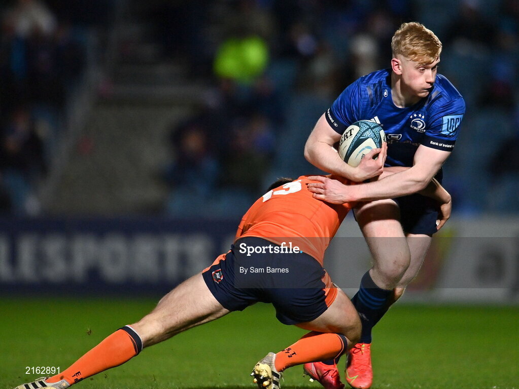 11 February 2022; Jamie Osborne of Leinster is tackled by Ramiro Moyano Joya of Edinburgh during the United Rugby Championship match between Leinster and Edinburgh at the RDS Arena in Dublin. Photo by Sam Barnes/Sportsfile
