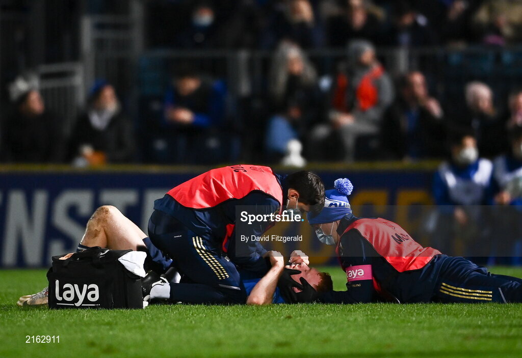 11 February 2022; Ciarán Frawley of Leinster receives treatment during the United Rugby Championship match between Leinster and Edinburgh at the RDS Arena in Dublin. Photo by David Fitzgerald/Sportsfile