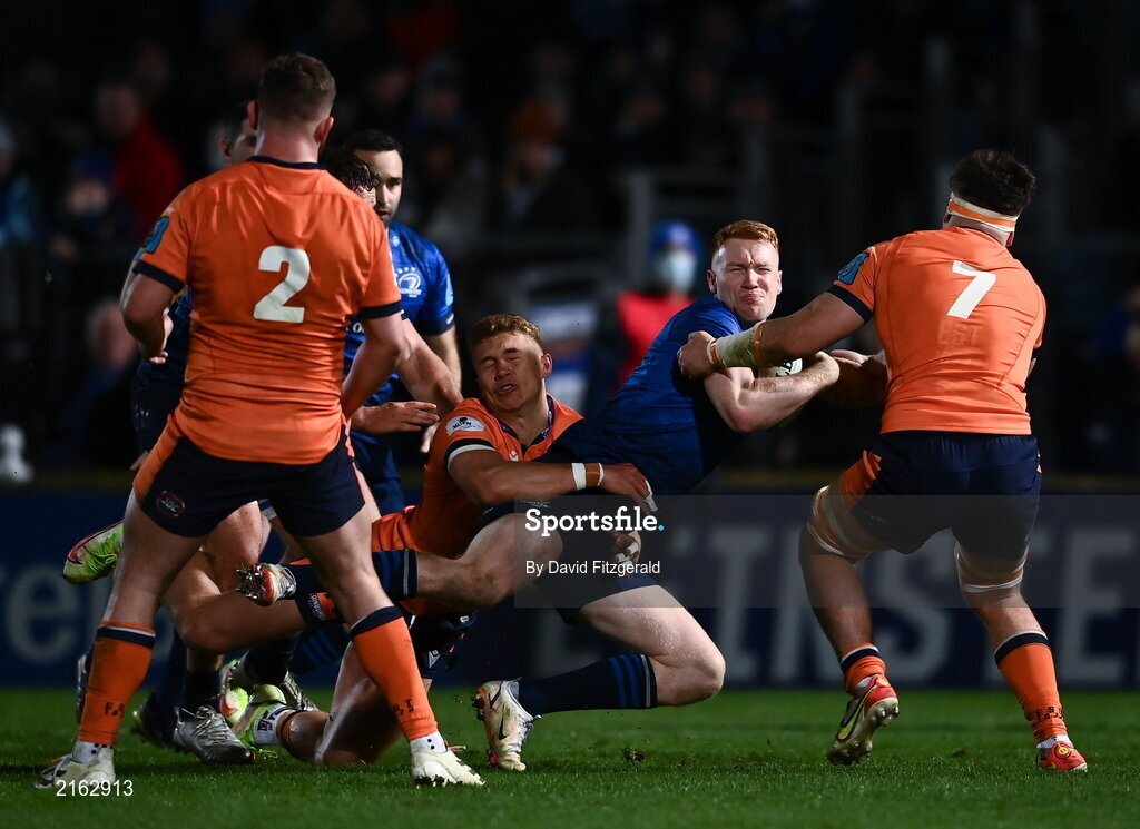 11 February 2022; Ciarán Frawley of Leinster is tackled by Connor Boyle of Edinburgh for which the Edinburgh player is awarded a yellow card for a high tackle during the United Rugby Championship match between Leinster and Edinburgh at the RDS Arena in Dublin. Photo by David Fitzgerald/Sportsfile