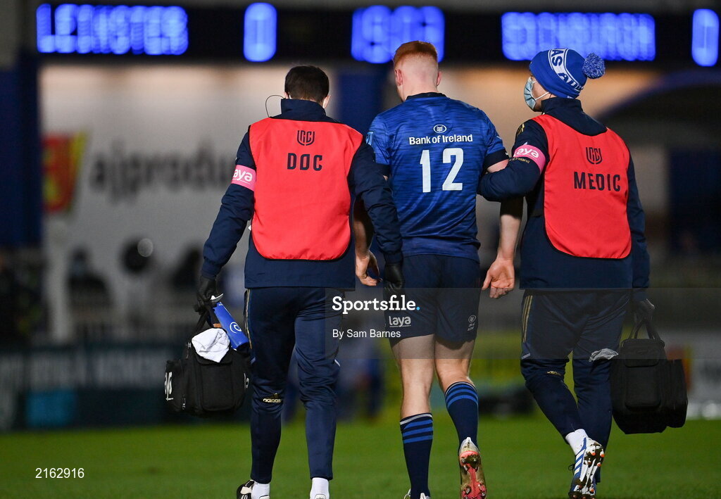 11 February 2022; Ciarán Frawley of Leinster leaves the field after picking up an injury during the United Rugby Championship match between Leinster and Edinburgh at the RDS Arena in Dublin. Photo by Sam Barnes/Sportsfile