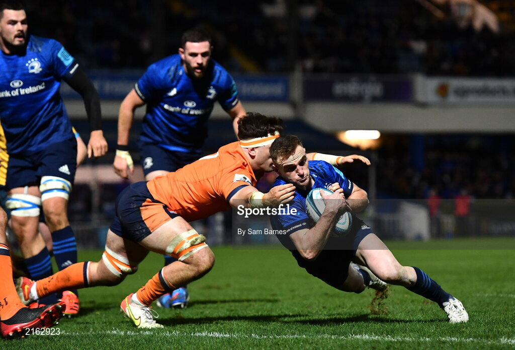 11 February 2022; Nick McCarthy of Leinster scores his side's second try despite the tackle of Connor Boyle of Edinburgh during the United Rugby Championship match between Leinster and Edinburgh at the RDS Arena in Dublin. Photo by Sam Barnes/Sportsfile