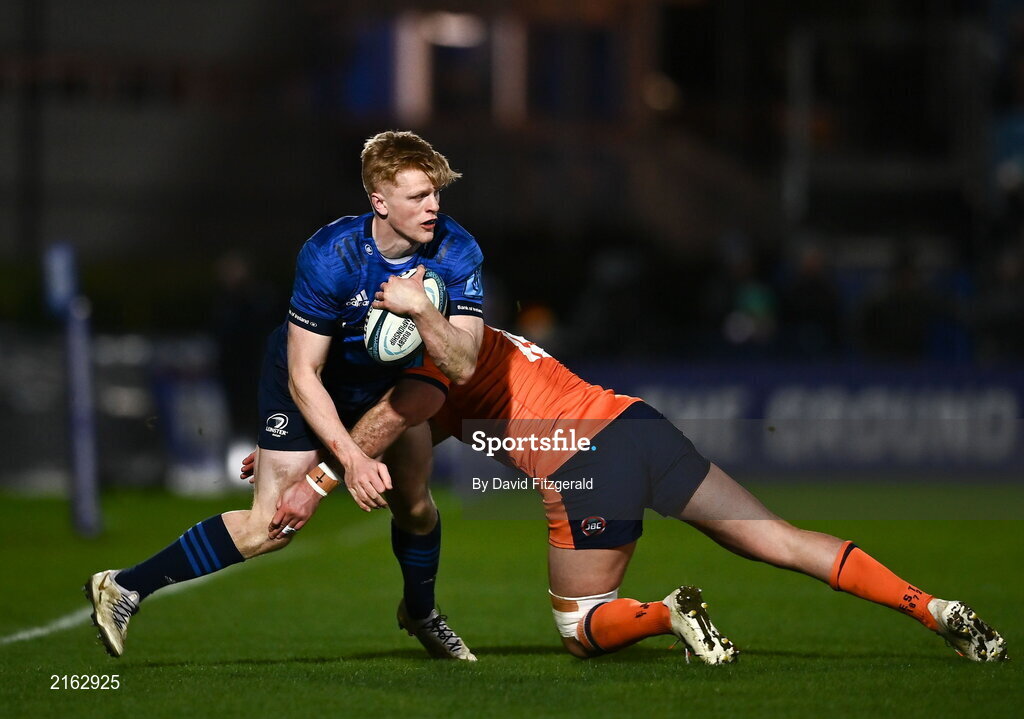 11 February 2022; Tommy O'Brien of Leinster is tackled by Henry Immelman of Edinburgh during the United Rugby Championship match between Leinster and Edinburgh at the RDS Arena in Dublin. Photo by David Fitzgerald/Sportsfile