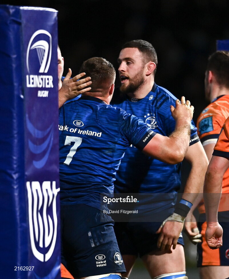 11 February 2022; Scott Penny of Leinster, left, is congratulated by Josh Murphy after he scored their side's first try during the United Rugby Championship match between Leinster and Edinburgh at the RDS Arena in Dublin. Photo by David Fitzgerald/Sportsfile