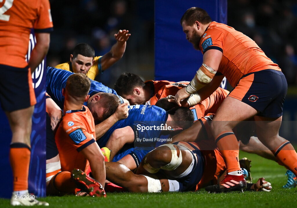 11 February 2022; Scott Penny of Leinster, hidden, scores his side's first try during the United Rugby Championship match between Leinster and Edinburgh at the RDS Arena in Dublin. Photo by David Fitzgerald/Sportsfile
