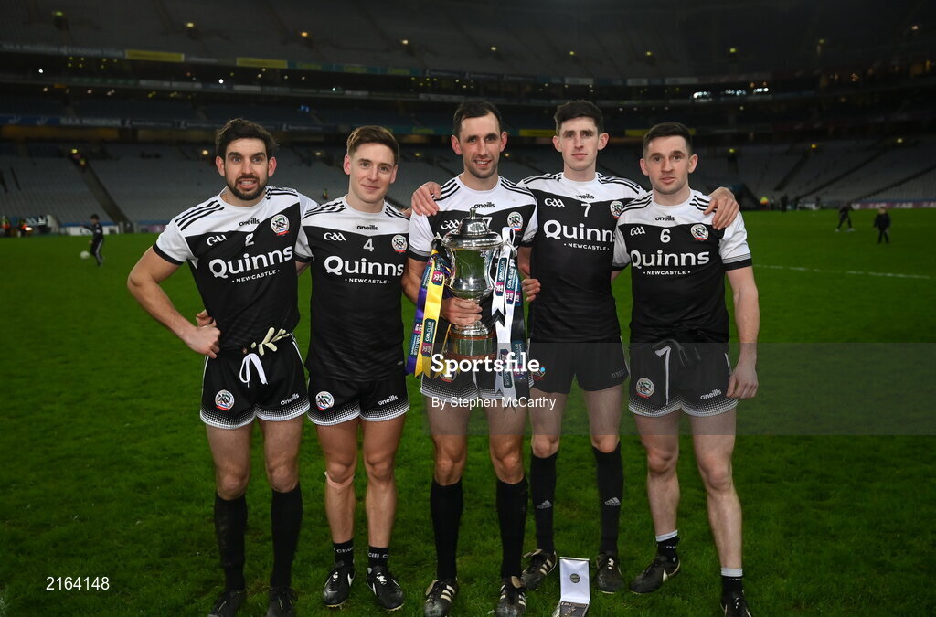 12 February 2022; Kilcoo players, from left, Niall Branagan, Aaron Branagan, Aidan Branagan, Eugene Branagan and Daryl Branagan celebrate with the Andy Merrigan cup after the AIB GAA Football All-Ireland Senior Club Championship Final match between Kilcoo, Down, and Kilmacud Crokes, Dublin, at Croke Park in Dublin. Photo by Stephen McCarthy/Sportsfile