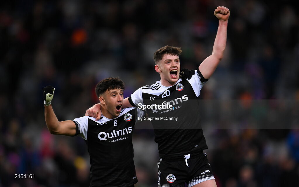 12 February 2022; Dylan Ward, left, and Anthony Morgan of Kilcoo celebrate at the final whistle of the AIB GAA Football All-Ireland Senior Club Championship Final match between Kilcoo, Down, and Kilmacud Crokes, Dublin, at Croke Park in Dublin. Photo by Stephen McCarthy/Sportsfile