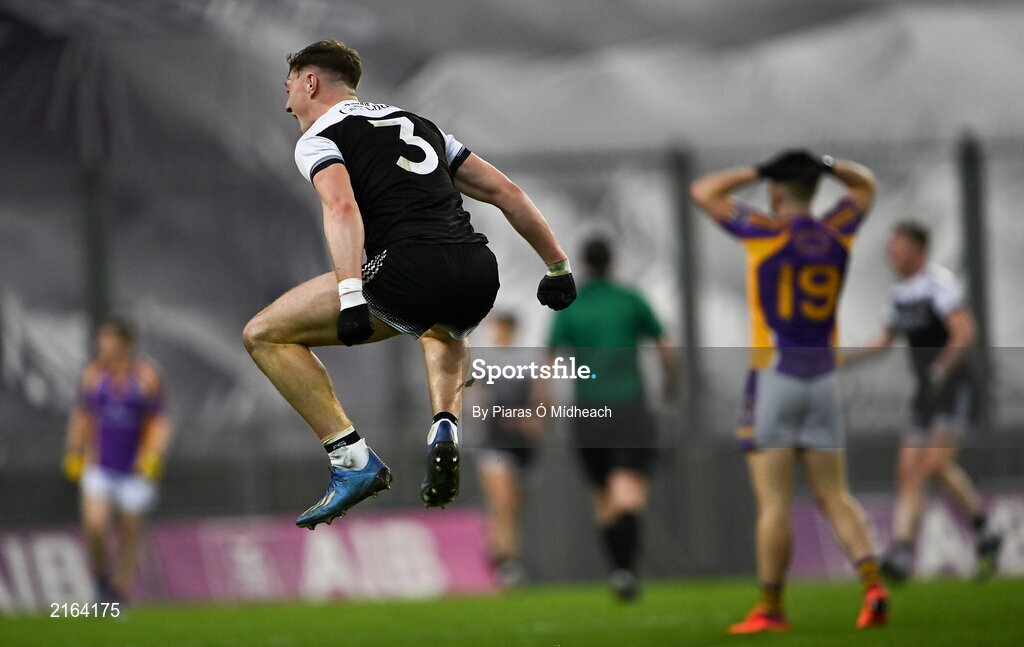 12 February 2022; Ryan McEvoy of Kilcoo celebrates a goal by teammate Jerome Johnston, not pictured in injury-time of the second half of extra-time, during the AIB GAA Football All-Ireland Senior Club Championship Final match between Kilcoo, Down, and Kilmacud Crokes, Dublin, at Croke Park in Dublin. Photo by Piaras Ó Mídheach/Sportsfile