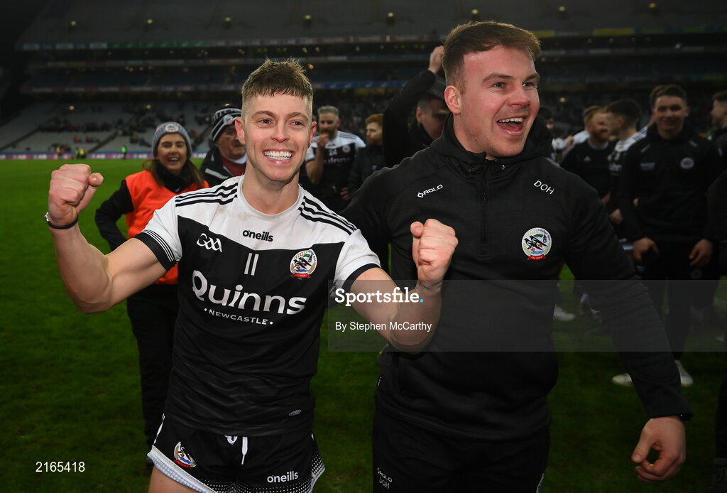 12 February 2022; Jerome Johnston of Kilcoo, left, celebrates after the AIB GAA Football All-Ireland Senior Club Championship Final match between Kilcoo, Down, and Kilmacud Crokes, Dublin, at Croke Park in Dublin. Photo by Stephen McCarthy/Sportsfile