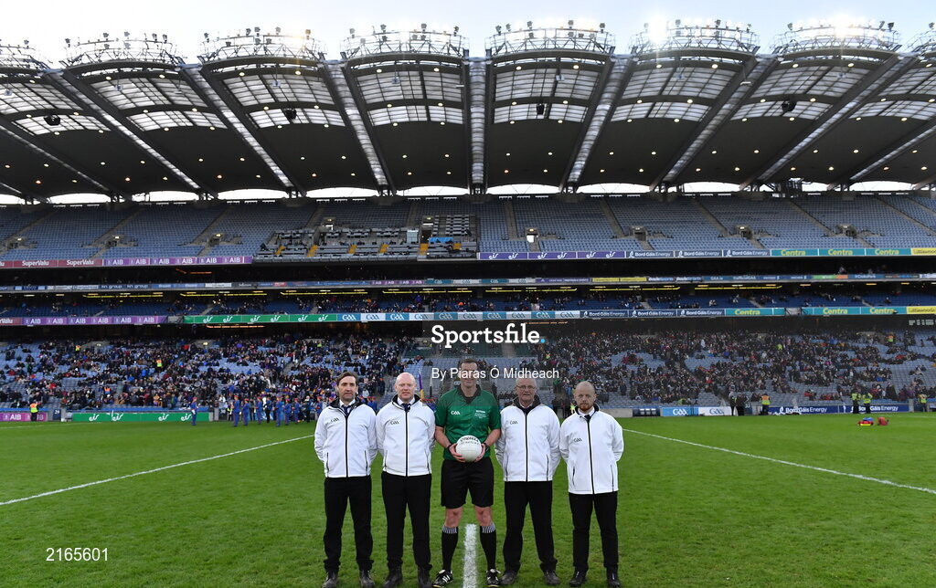 12 February 2022; Referee Seán Hurson with his umpires before the AIB GAA Football All-Ireland Senior Club Championship Final match between Kilcoo, Down, and Kilmacud Crokes, Dublin, at Croke Park in Dublin. Photo by Piaras Ó Mídheach/Sportsfile