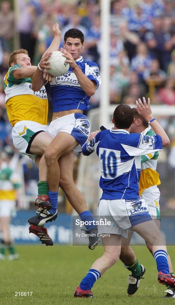 30 July 2006; Brendan Quigley, Laois, contests a high ball with Neville Coughlan, Offaly. Bank of Ireland All-Ireland Senior Football Championship Qualifier, Round 4, Laois v Offaly, O'Moore Park, Portlaoise, Co. Laois. Picture credit; Damien Eagers / SPORTSFILE
