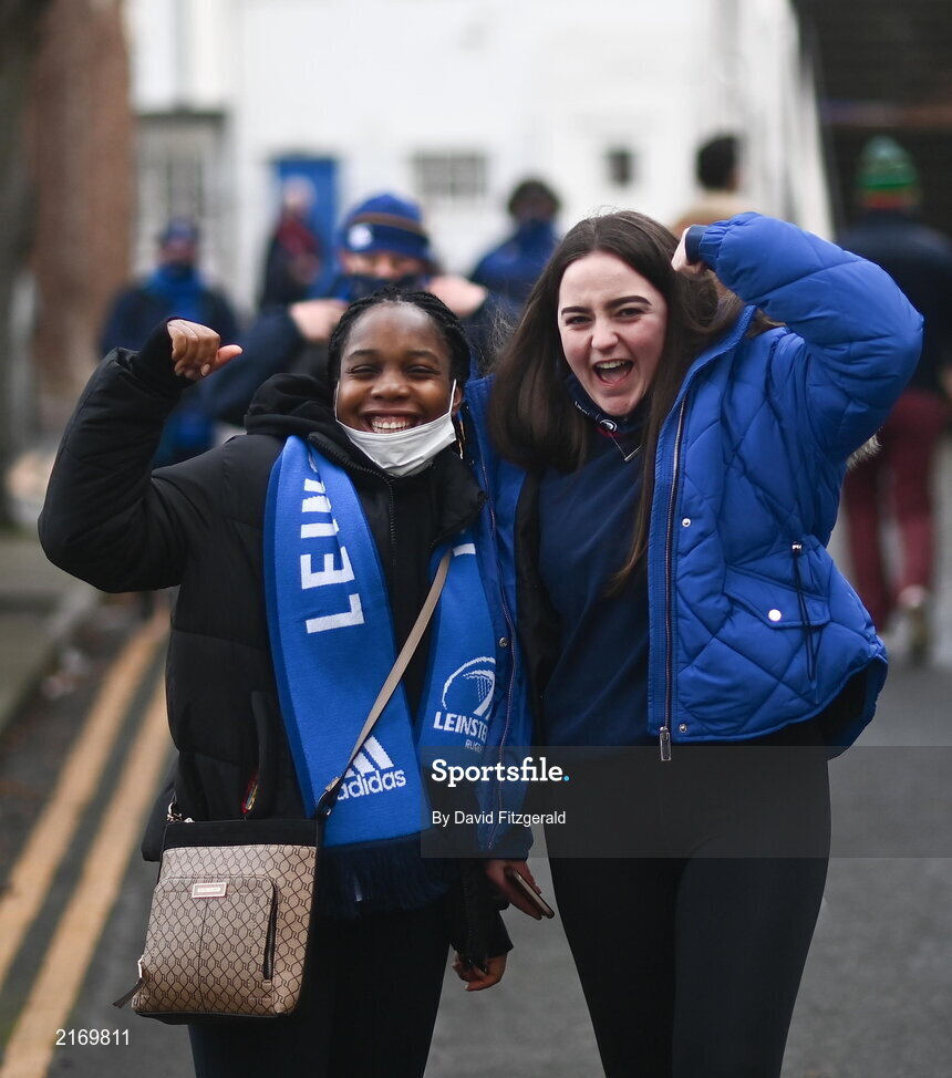 19 February 2022; Leinster supporters Ronke Ola Tinwo, left, and Andrea Murray arrive before the United Rugby Championship match between Leinster and Ospreys at RDS Arena in Dublin. Photo by David Fitzgerald/Sportsfile