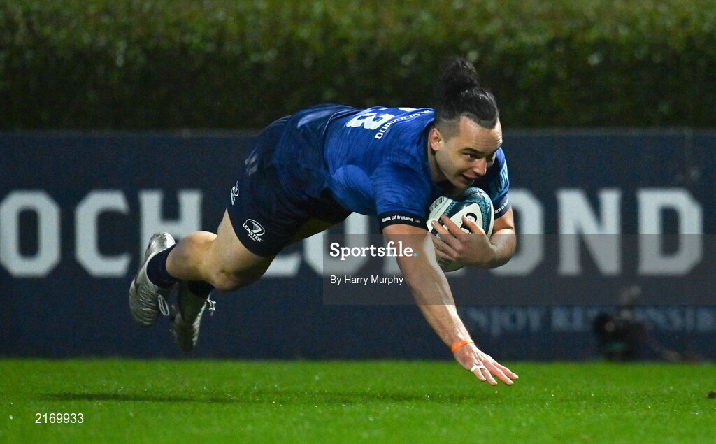19 February 2022; James Lowe of Leinster dives over to score his side's third try during the United Rugby Championship match between Leinster and Ospreys at RDS Arena in Dublin. Photo by Harry Murphy/Sportsfile