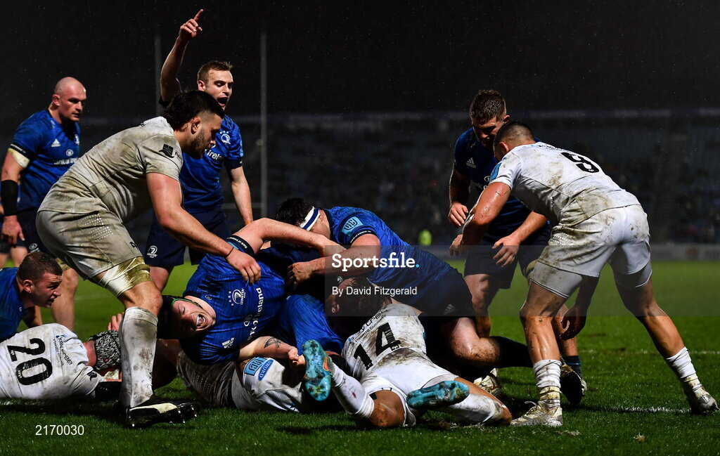 19 February 2022; Leinster are held up on the try line by Ospreys players during the United Rugby Championship match between Leinster and Ospreys at RDS Arena in Dublin. Photo by David Fitzgerald/Sportsfile