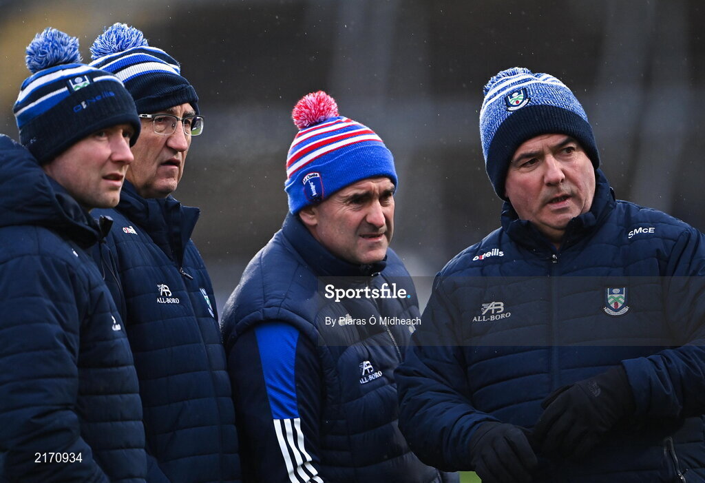 19 February 2022; Monaghan manager Séamus McEnaney, right, with members of his backroom team, from left, Vinny Corey, Donie Buckley, and Liam Sheedy before the Allianz Football League Division 1 match between Armagh and Monaghan at Athletic Grounds in Armagh. Photo by Piaras Ó Mídheach/Sportsfile