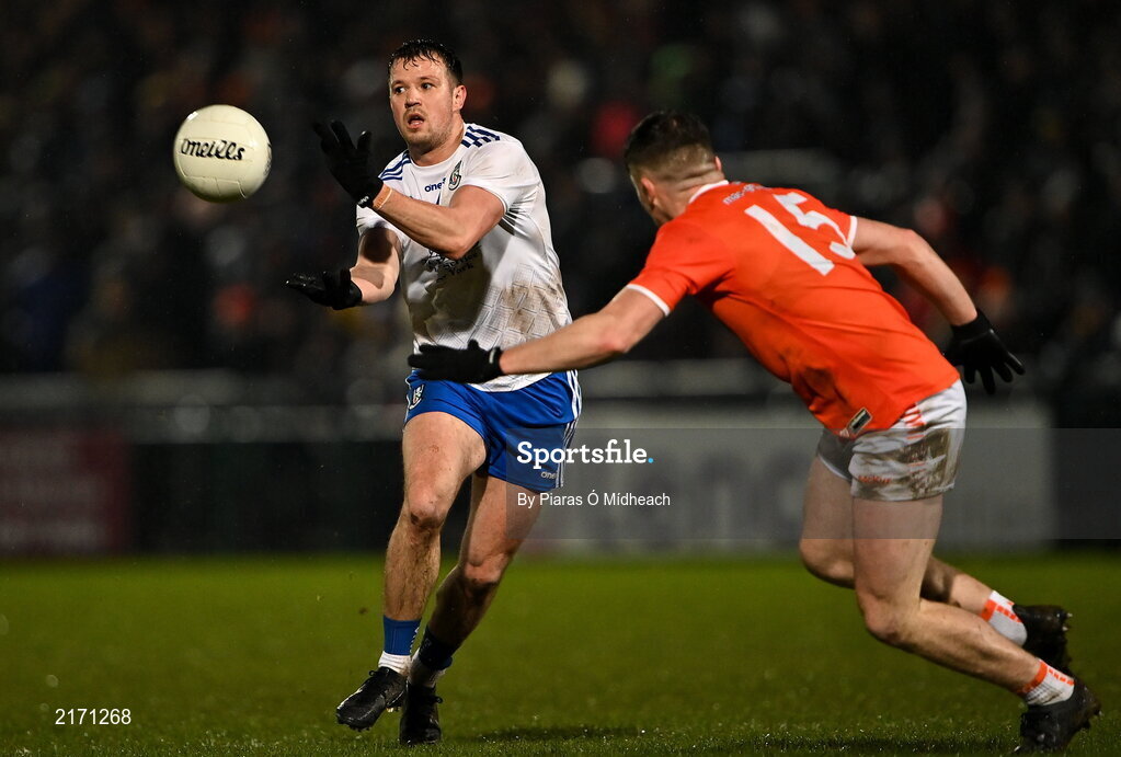 19 February 2022; Ryan Wylie of Monaghan in action against Aidan Nugent of Armagh during the Allianz Football League Division 1 match between Armagh and Monaghan at Athletic Grounds in Armagh. Photo by Piaras Ó Mídheach/Sportsfile